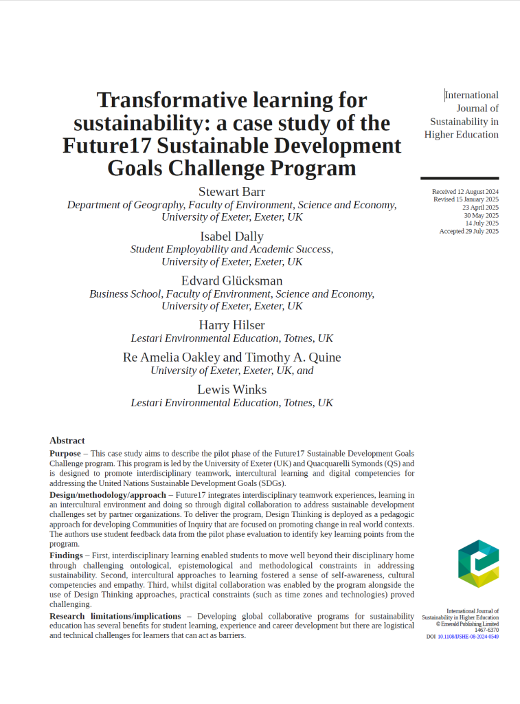 Barr, S., Dally, I., Glücksman, E., Hilser, H., Oakley, R. A., Quine, T. A., & Winks, L. (2025). Transformative learning for sustainability: a case study of the Future17 Sustainable Development Goals Challenge Program. International Journal of Sustainability in Higher Education.